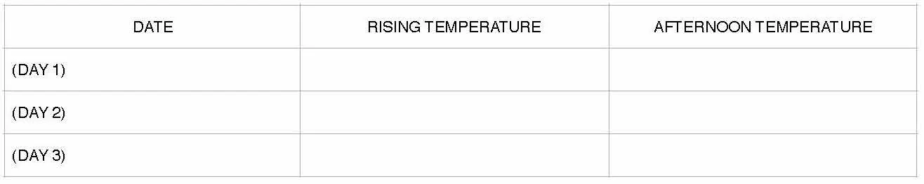 3. Immediately upon waking, turn on the thermometer and place it deep in your armpit and leave in place for 3 minutes (10 minutes if using a shakedown mercury thermometer - shake it down first). The less movement you make, the more accurate the test. Lie as still as possible. (The beeper may sound but the temperature should continue to monitor. Record below.
